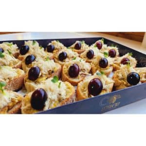 כמות של ריבועי פולנטה,גבינת עזים ובצל מקורמל